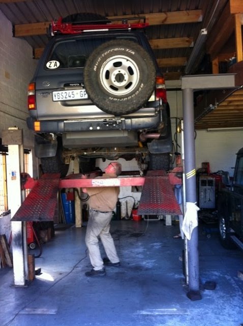 As Ang eluded to in the last post we had a little scare regarding Michael's brakes. It appears that the brakes were not checked as part of the major service I had done in November. An oversight? or perhaps stopping before you plummett off a rocky pass in the middle of nowhere is not as important as I once thought. So I got the brakes sorted in Joburg two day before we left. Due to the fact that these should have been checked, I decided to book Michael in for a quick once over here in Cape Town. So on Saturday he had his under parts thoroughly checked by Jim, but he likes it when I call him "Big Jim".